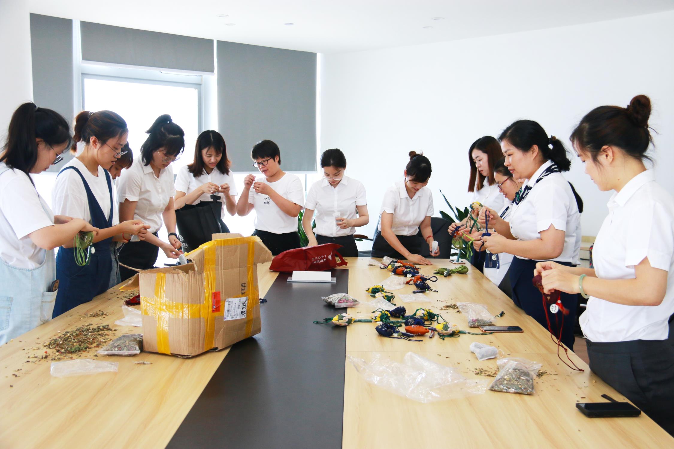 佩香囊,是端午傳統習俗之一。香囊內的中草藥,有清香、驅蟲、避瘟、防病的功能。在端午節來臨之際,百盛“女神”們利用中午休息時間親手制作了寓意吉祥的香囊。大家齊心協力,一塊塊布、一袋袋材料就變成了一個個小巧玲瓏、色彩斑斕的香囊。