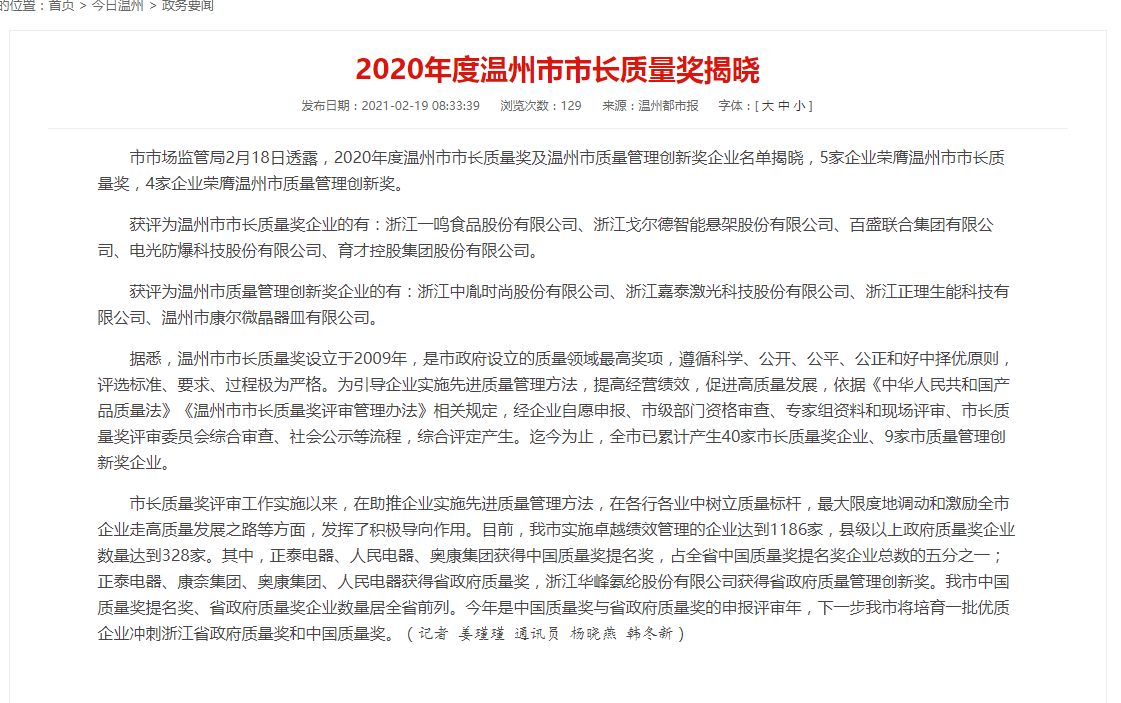 日前,2020年溫州市市長質量獎評審結果正式揭曉,五家企業(yè)獲此殊榮,百盛聯合集團有限公司榜上有名。