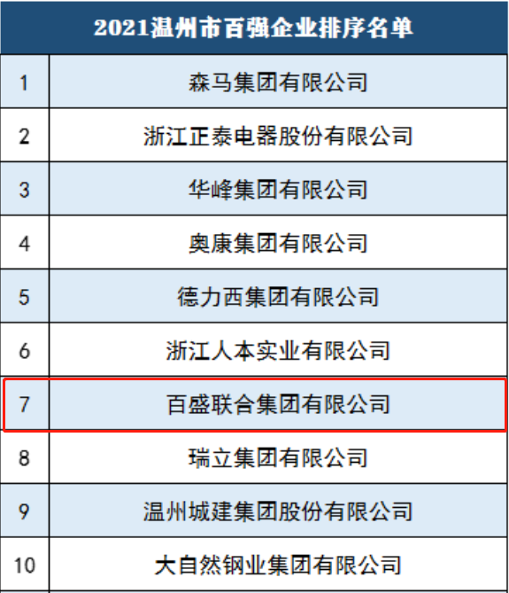 近日,溫州市企業聯合會、溫州市企業家協會、溫州市工業經濟聯合會聯合發布2021溫州市綜合百強企業系列榜單。憑借卓越的綜合實力、穩健的經營態勢,百盛聯合集團躋身溫州市百強企業,位列第7。