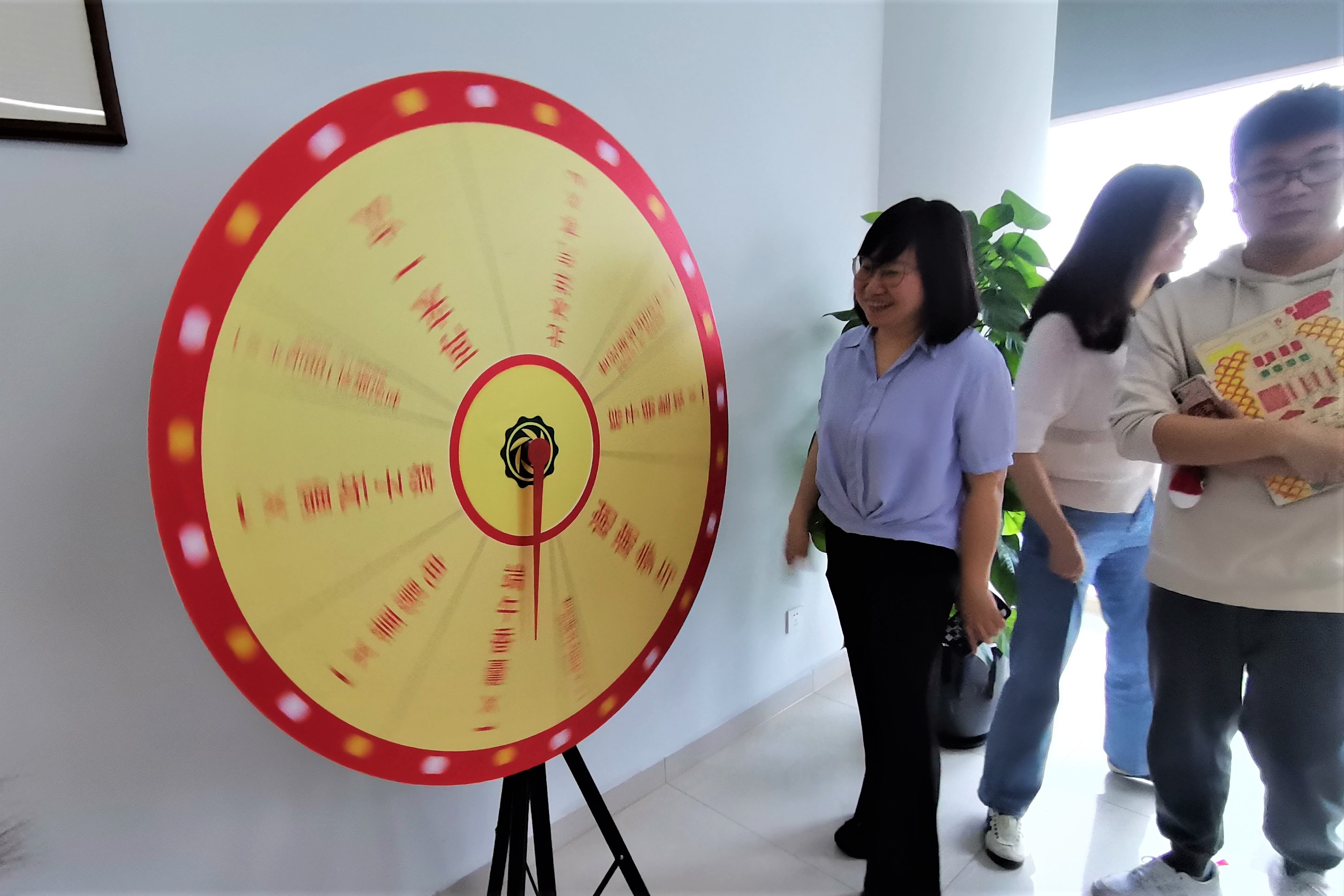 “粽享幸運”是通過轉大轉盤轉出一份禮物,轉出一份幸運。轉盤上劃著不等分的8份獎品,每人都想轉到心中的幸運大獎。隨著轉盤的慢慢停止或者回轉,吸引了在場所有人的目光。活動現場其樂融融,歡聲笑語,彌漫著濃濃的節日氛圍。