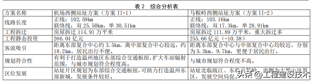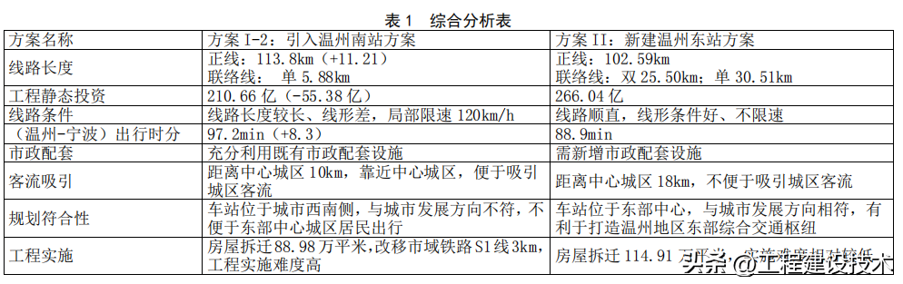 引入溫州南站方案(方案Ⅰ-2)與新建溫州東站方案(Ⅱ)綜合比選分析如下: