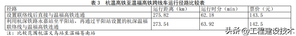 從運行徑路角度分析,杭溫高鐵至福州方向與溫福高鐵的連通有兩個徑路,設置聯絡線較不設置聯絡線,運行距離長2.3km,運行時分節省1.7min。