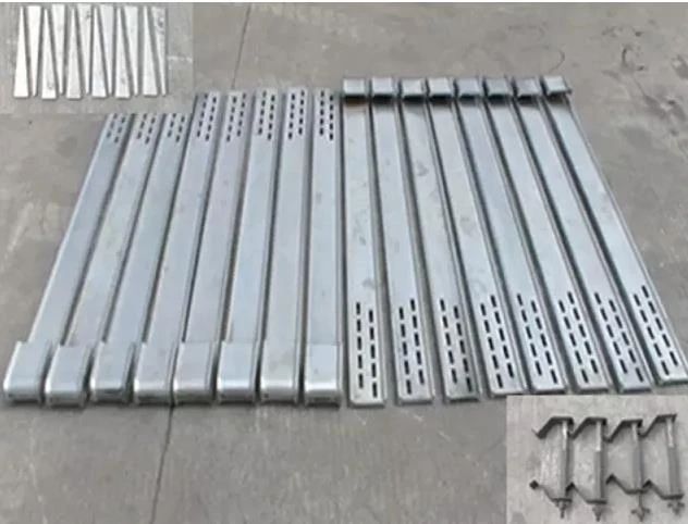 6、4片單彎卡板穿插完成,單彎卡板的彎頭與直端的交匯處是直端面上規整的方孔,將4片斜鐵緊貼彎頭外緣依次插入方孔,然后用錘子均力切入4片楔形鐵。