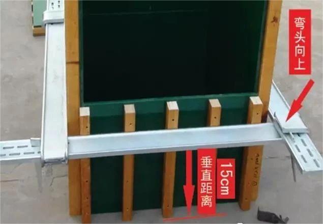 2、安裝第1套緊固件時,先將4片單彎卡板及4片楔形鐵規整好,然后用卷尺自地面處垂直沿方柱模板4個對角邊緣標出15厘米。也就是說,第1套緊固件安裝的位置就在距地面15厘米的方柱模板處。