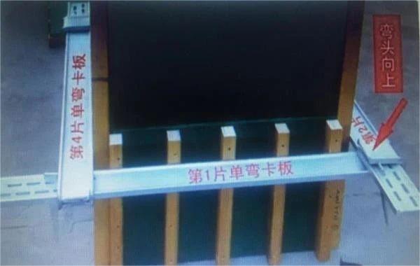 3、在此位置處安裝方圓輔助支架,起到支撐四片單彎卡板的作用,便于操作安裝。先將第1片單彎卡板彎頭朝上緊貼在方柱模板的一側,對應的沿該卡板彎頭處穿入第2片單彎卡板,第2片單彎卡板同樣緊貼在方柱模板的一側。安裝第1、2片單彎卡板的水平高度要相同,時刻保證安裝位置的水平一致性。