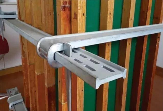 方圓扣可調模板加固施工原理是通過控制四個卡箍的空心槽來控制方柱的尺寸,采用楔形工具插入空心槽,卡箍末端上的空心槽與楔形工具配合可以加固各種尺寸的方柱。四個卡箍相互咬合形成水平整體對方柱模板進行加固。適用于不同尺寸的方柱模板加固。